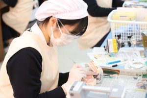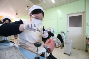 「歯内療法学」の実習風景です。今回は、歯内療法学の先生のご指導のもと、歯の神経を抜く実習を模型を使って行いました。器具の扱い方から形成の基本ステップまで、丁寧な指導を受けながら、学生たちは一つひとつの操作を確かめるように取り組んでいました。
