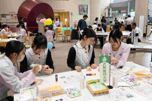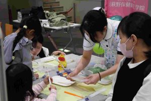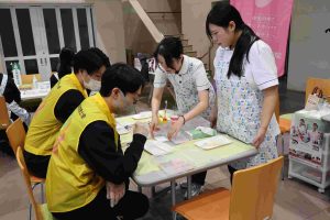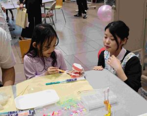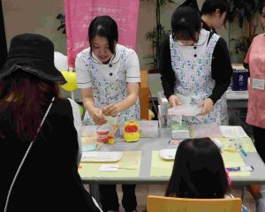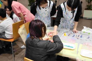ボランティアとして参加した1年生の学生4名は、終始笑顔を絶やさず、丁寧な対応で、歯ブラシの柄に歯ブラシ用ピンセットで、かわいいキラキラパーツを貼りつけたり、正しい歯みがきの方法やお口の健康の大切さをわかりやすく伝える役目をしっかりとこなしていました。子どもから大人まで幅広い世代の方々に楽しんでいただき、学生たちにとっても貴重な実践の機会となりました。また当日は、中学生や高校生の来場もあり、学生たちが活動する姿を間近に見ていただくことで、本学院の学びや歯科衛生士という職業への関心を高めていただく良い機会にもなりました。進路を考える若い世代にとって、将来の選択肢のひとつとして歯科衛生士の魅力を知っていただけたことは、広報活動としても大きな意義があったと感じています。