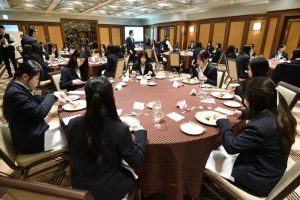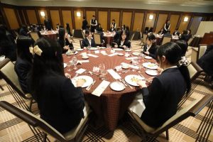 会場では、食事の際の所作や気遣い、ナプキンの使い方、カトラリーの扱い方など、実践を交えながら丁寧に学びました。初めは緊張した面持ちだった学生たちも、講師の方の温かいご指導のもと、次第に笑顔がこぼれ、和やかな雰囲気の中で食事を楽しむ姿が見られました。