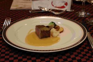 ↑肉料理の「牛サーロインのロースト温野菜添え 醤油風味ソース」です。