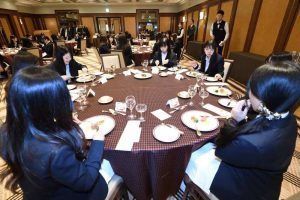 会場では、食事の際の所作や気遣い、ナプキンの使い方、カトラリーの扱い方など、実践を交えながら丁寧に学びました。初めは緊張した面持ちだった学生たちも、講師の方の温かいご指導のもと、次第に笑顔がこぼれ、和やかな雰囲気の中で食事を楽しむ姿が見られました。