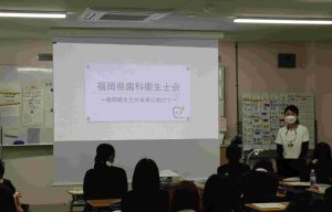 令和7年12月10日(水)、本学院に福岡県歯科衛生士会の役員の方をお招きし、3年生を対象に「歯科衛生士会入会案内」が行われました。本案内は、来年3月に国家試験を控える学生たちにとって、歯科衛生士としての第一歩を見据える大切な機会となりました。当日は、歯科衛生士会の概要や活動内容、入会の意義について丁寧にご説明いただき、さらに卒業後のサポート体制についても具体的にご紹介いただきました。歯科衛生士会は、専門職としての資質向上や継続的な学びの場を提供するとともに、地域の口腔保健活動や災害時の支援活動など、社会貢献にも積極的に取り組んでいます。学生たちは、説明を通じて歯科衛生士としての責任と可能性を改めて実感し、真剣な表情で耳を傾けていました。